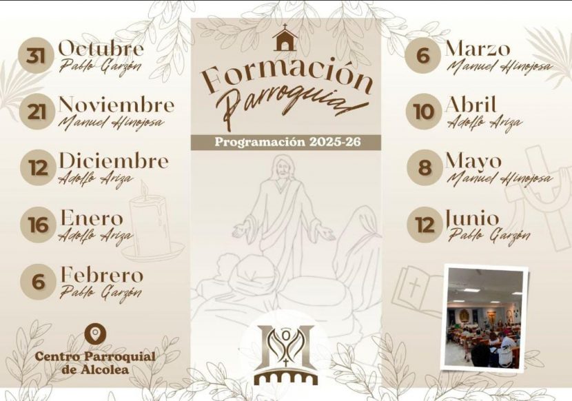 Comienza el ciclo de formación del curso pastoral 2025-2026. Será este viernes 31 de octubre a las 20:00 horas, al término de la Eucaristía. Nos vemos en los salones parroquiales.